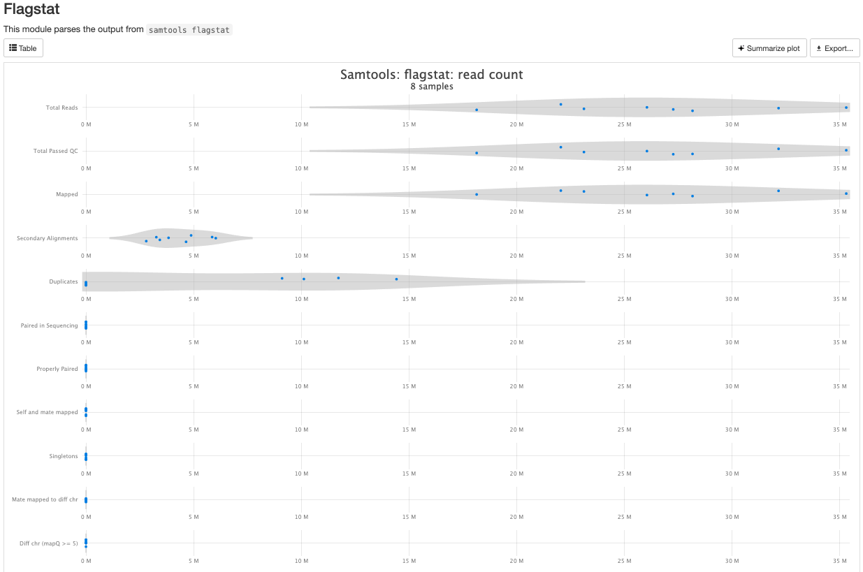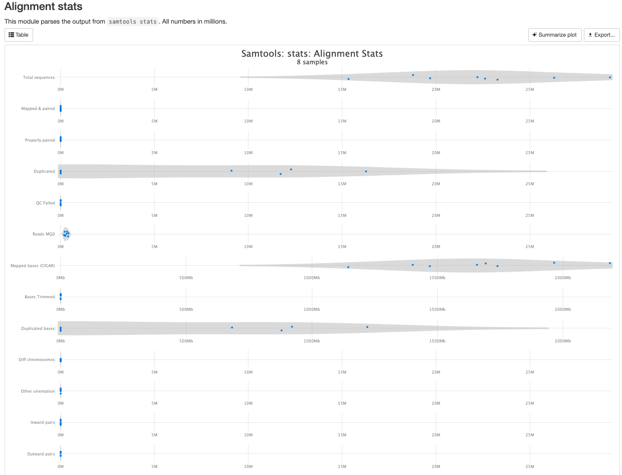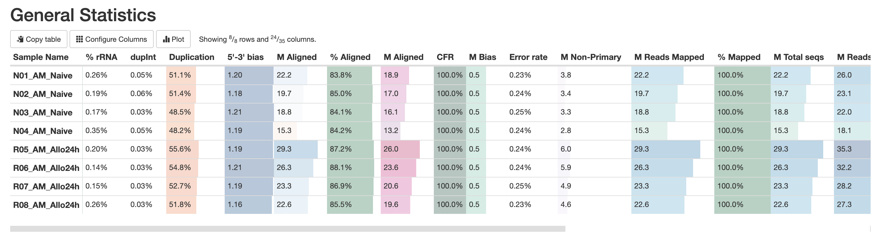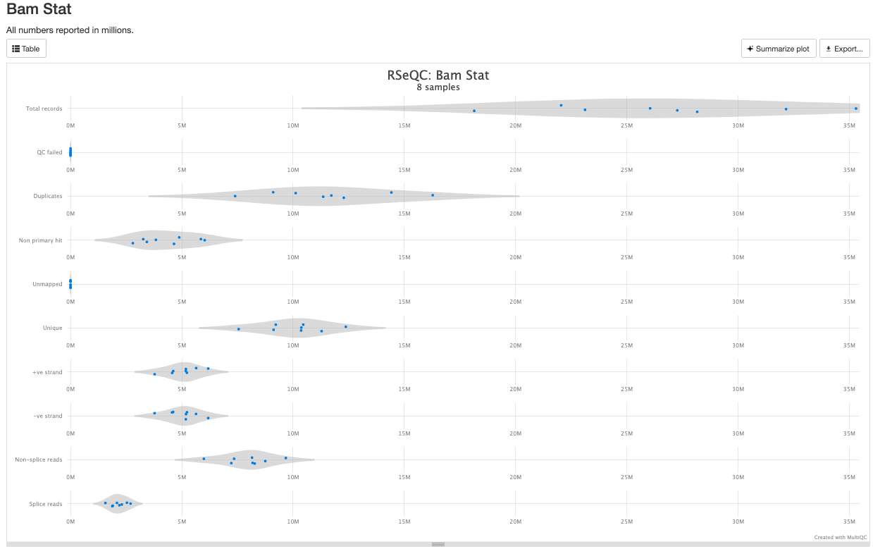The first table in the multiqc report is the “General Statistics Table”. This provides a high level overview of various metrics, from read counts in the BAM to read counts in the FASTQ. It’s a lot of metrics, but this is useful in the accessing if a large amount of data filtration occur. This is also a good place to check if the samples have sufficient sequencing depth. Standard mRNA-Sequencing typically requires an average of ~25M reads. This requirement increases for whole-transcriptome (where other RNA species are also quantified). For more reading abour sequencing depth consideration, please visit this Illumina resource.