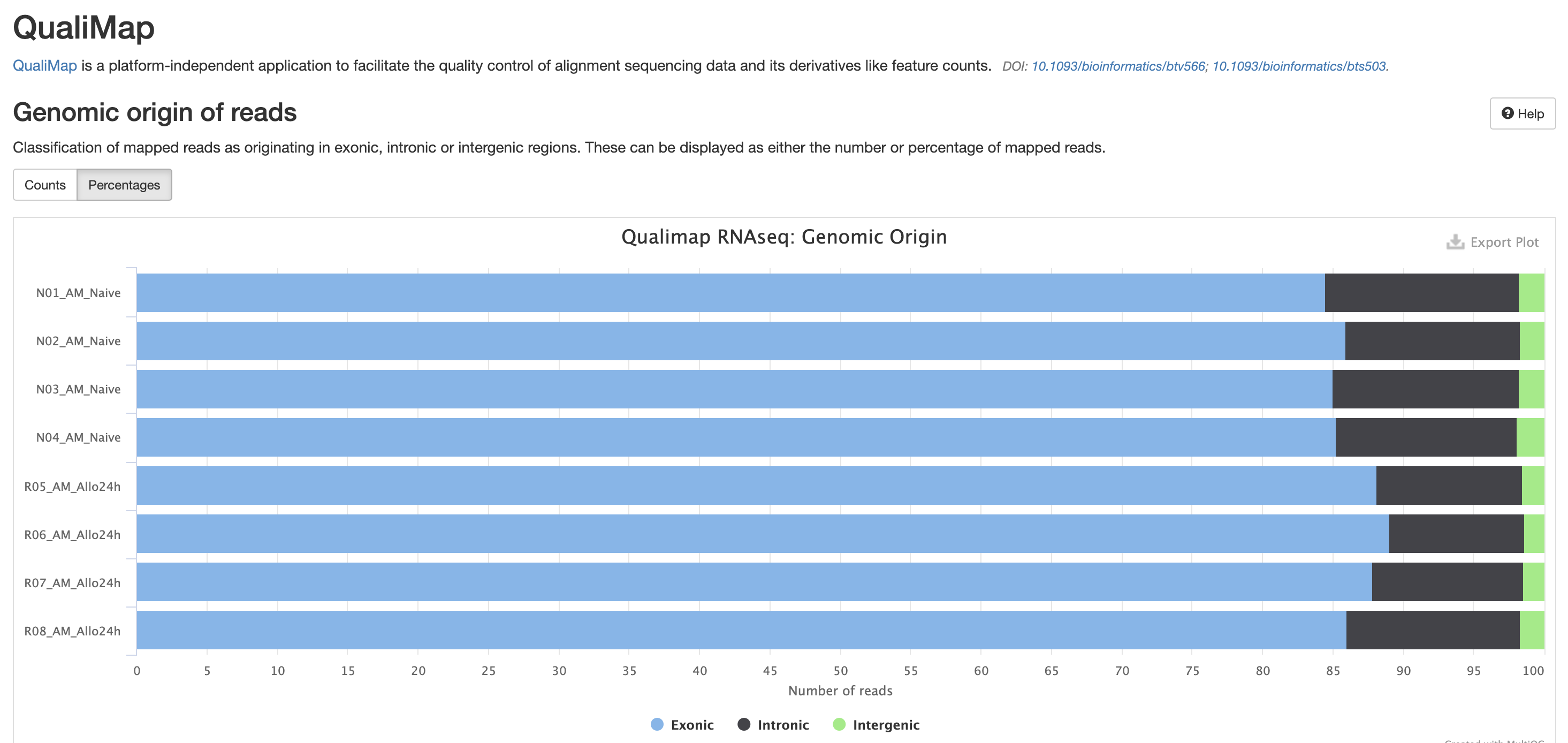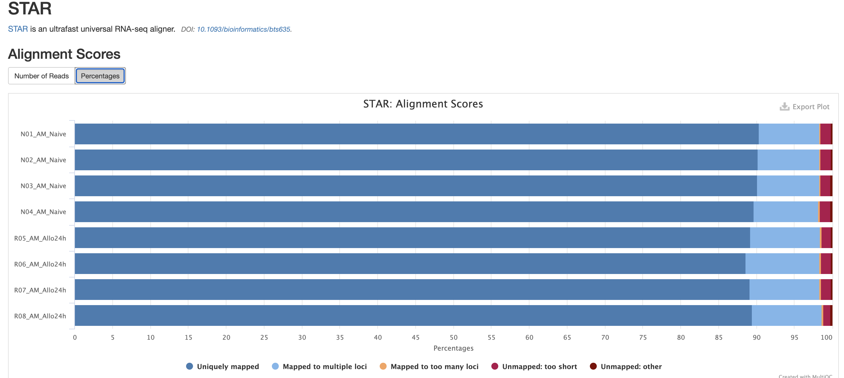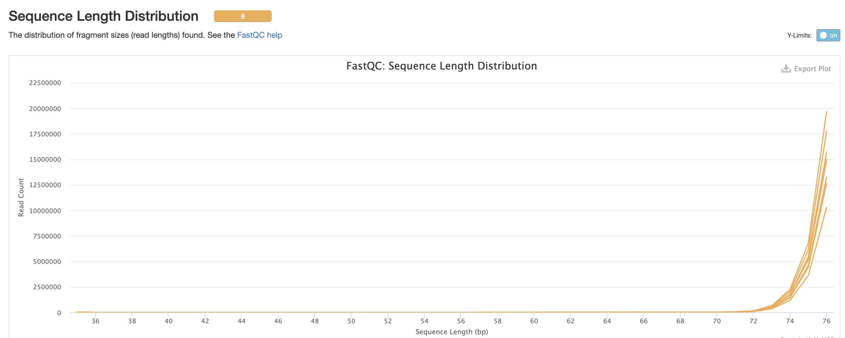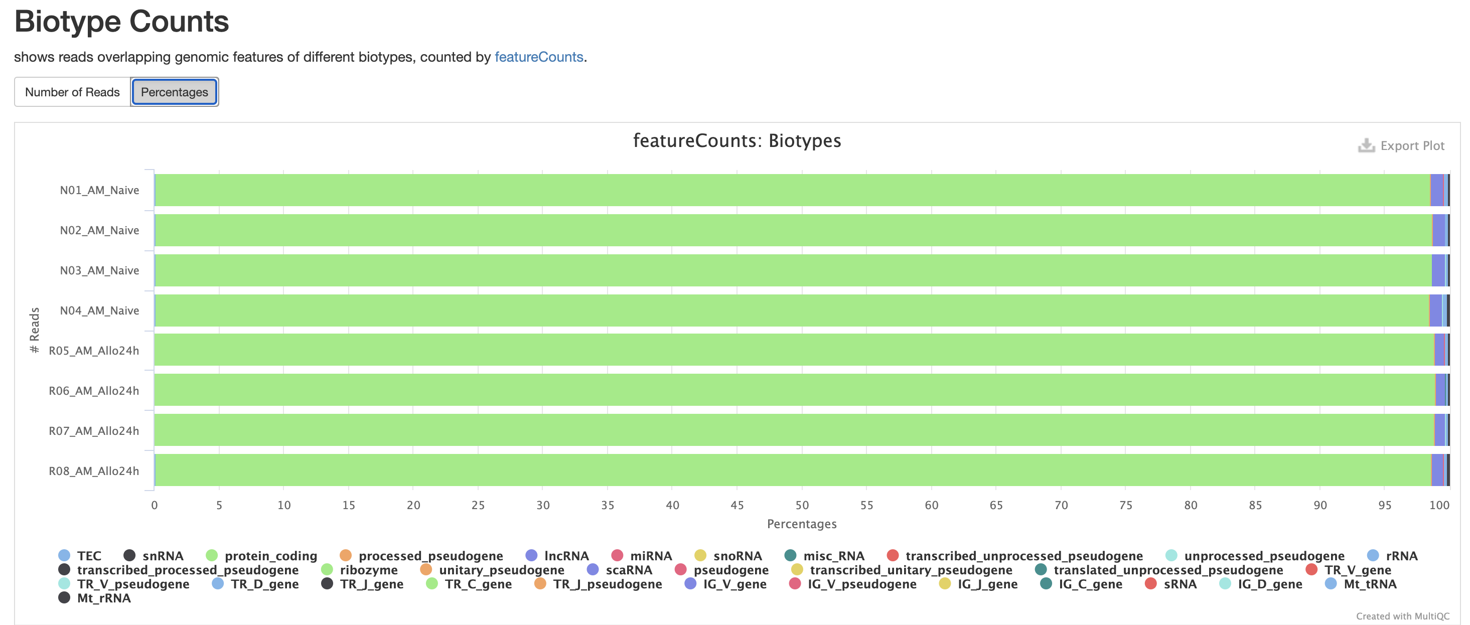 The first table in the multiqc report is the “General Statistics Table”. This provides a high level overview of various metrics, from read counts in the BAM to read counts in the FASTQ. It’s a lot of metrics, but this is useful in the accessing if a large amount of data filtration occur. This is also a good place to check if the samples have sufficient sequencing depth. Standard mRNA-Sequencing typically requires an average of ~25M reads. This requirement increases for whole-transcriptome (where other RNA species are also quantified). For more reading abour sequencing depth consideration, please visit this Illumina resource.