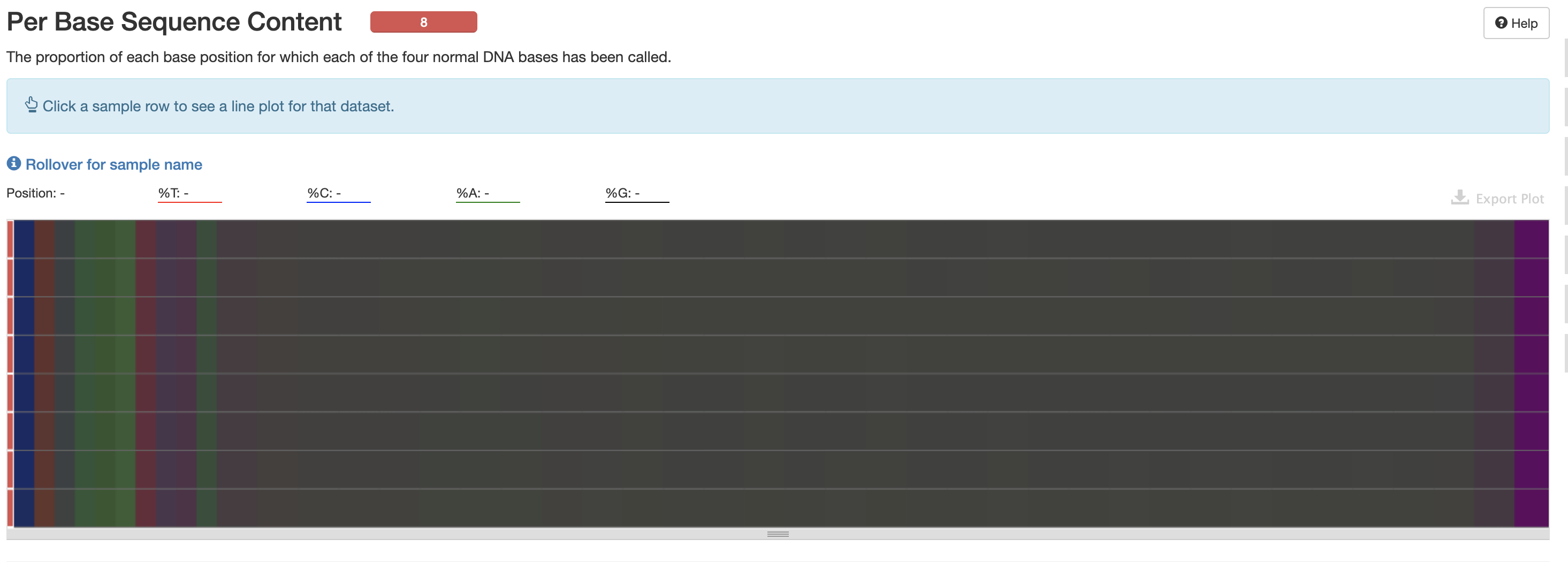 The Per Base Sequence Content is very useful for determing if there is any potential issue with the FASTQ. You’ll again notice there are issues at the start and end of the reads and its universal across samples. Clicking each row provides a better view of which base is the strongest. This is again pretty expected for reasons mentioned earlier, but always worth investigating.
