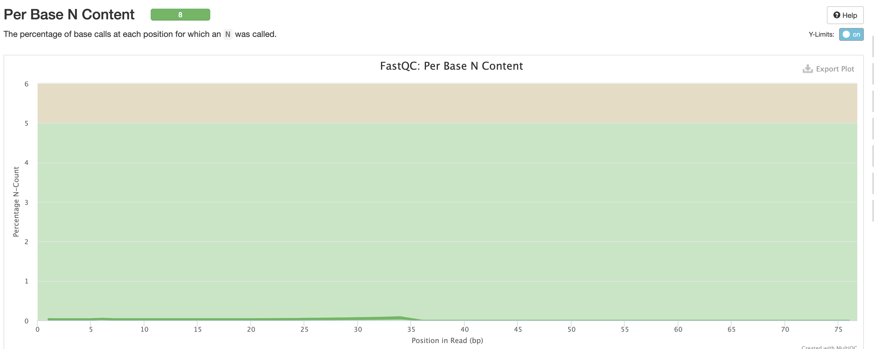 Per Base N Content indicates how many ‘N’s’ were detected in the dataset. N’s mean the base was unable to be determined, and high levels could indicate a potentially significant sequencer error.