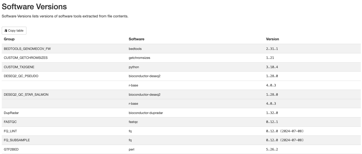 Finally there are the workflow data. Just below the citations, are the tool versions. This is useful for manuscript writing, and for reporting tool-specific versions (along with the rnaseq workflow version). It is also critical to cite the workflow, the nf-core community and the tools’ developers at the writing stage (many of these tools have published papers available for citation).
