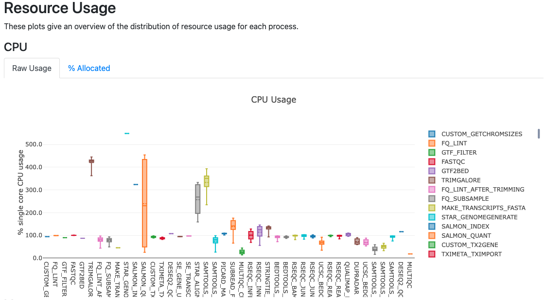 The report file provides details on the resource and timings for each process that was executed as part of the workflow. This is useful in helping to narrow down jobs with high memory usage for optimization purposes.