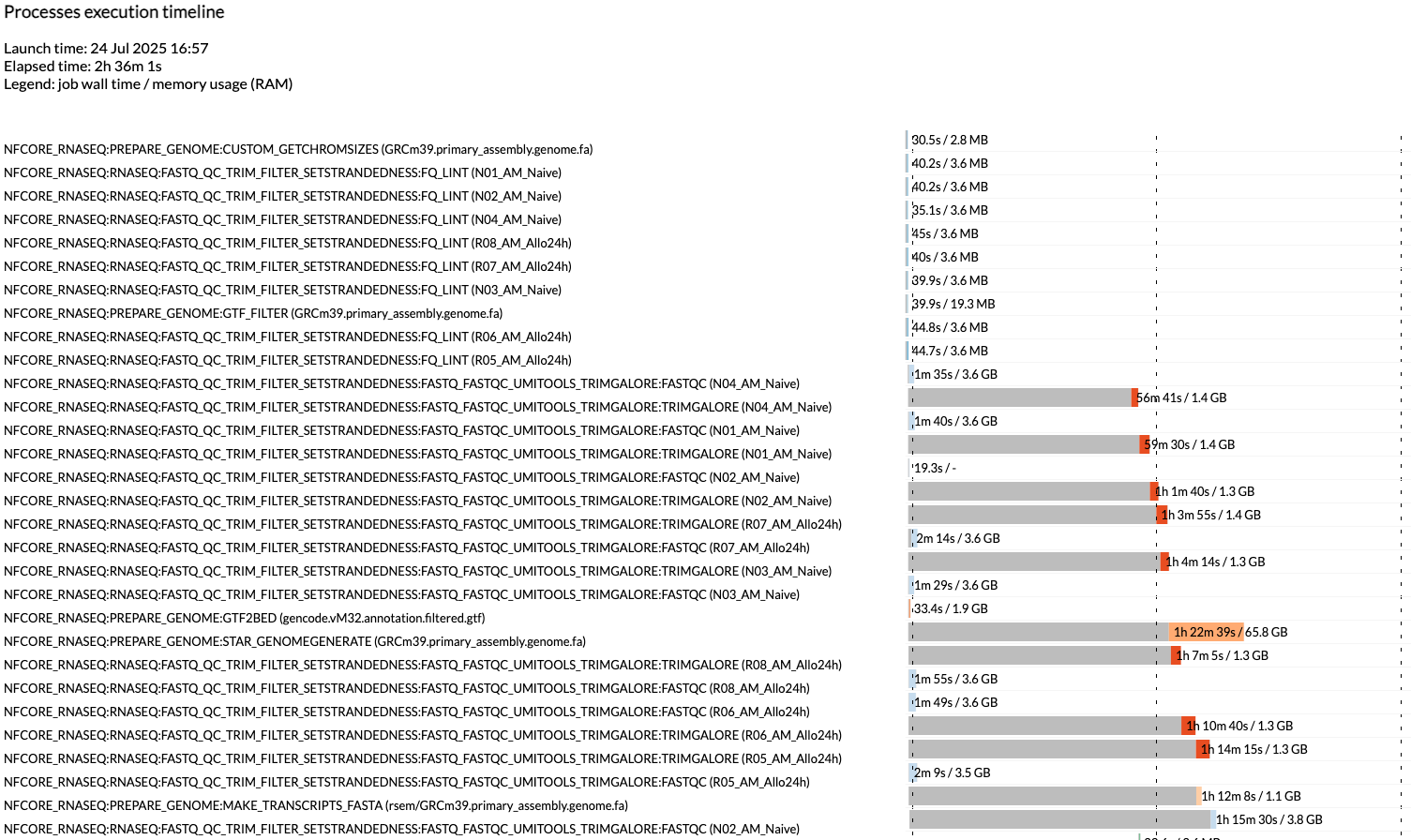 The timeline file provides a detailed timeline noting when each process was executed. This is especially useful in being able to estimate how long a workflow may take and to identify long running tools.